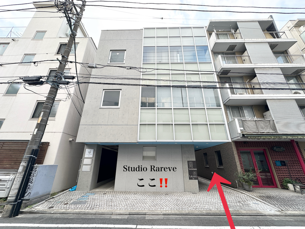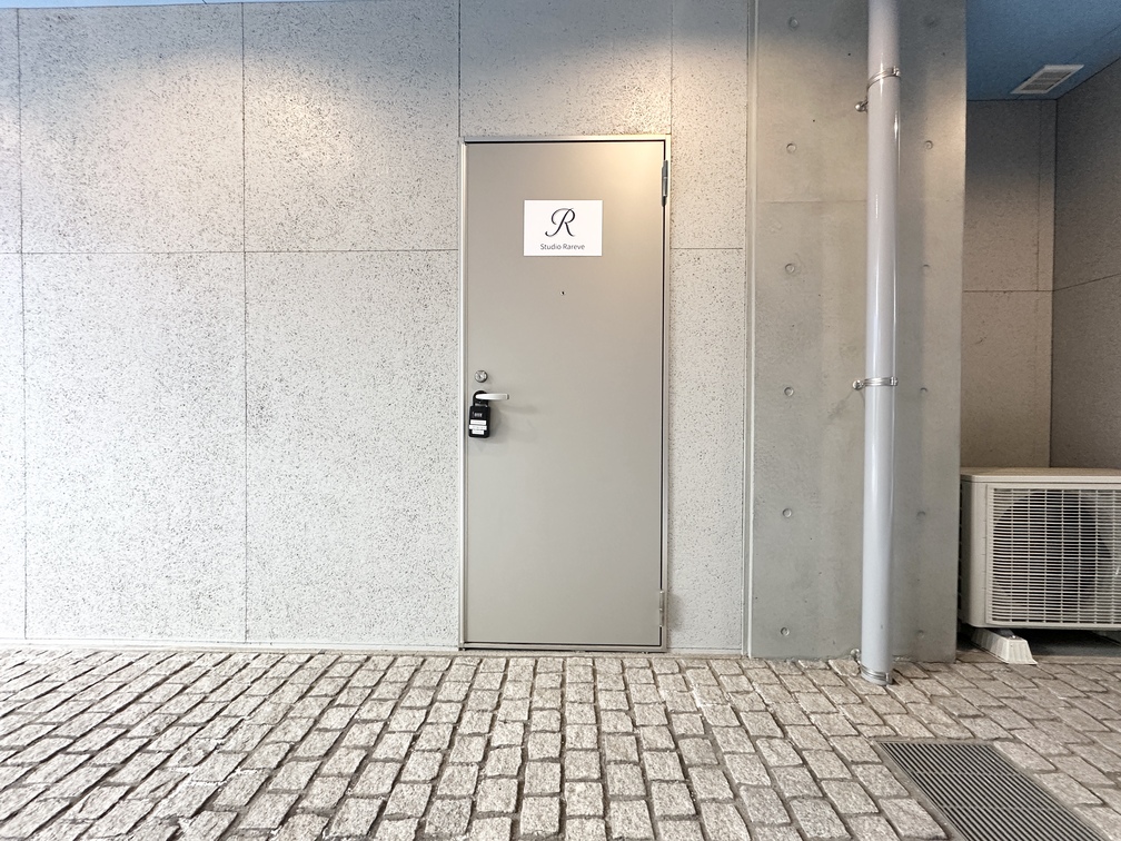 入り口は建物右側にあり、レンタルスタジオ Rareveは1階にございます。